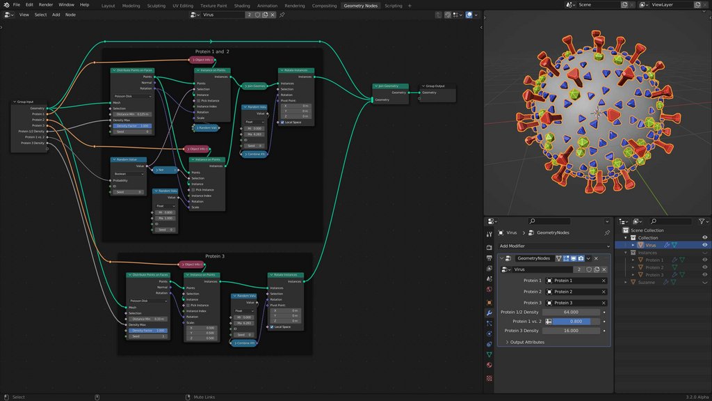 In der Blender AG haben wir Geometry Nodes gelernt. Geometry Nodes ist eine Art Programmiersprache, mit der man 3D-Objekte erzeugen kann. Dieser Virus hat 3 verschiedene Proteine. Die Proteine 1 und 2 werden zusammen auf der Oberfläche verteilt und dann wird zufällig eines der Beiden gewählt… Das 3. Protein wird mit dem 1. und 2. und dem Grundobjekt zusammengefügt und dargestellt.