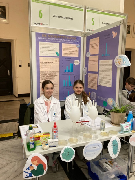 Beim Besuch an der Leibniz Universität Hannover haben Lavinia Fineschi Sergardi (7a) und Emilia Jarema (7c) ihr Projekt „Die saubersten Hände“ im Fachbereich Biologie in der Altersklasse schüler experimentieren (bis Klasse 8) der Fachjury und einem breiten interessierten Publikum vorgestellt.