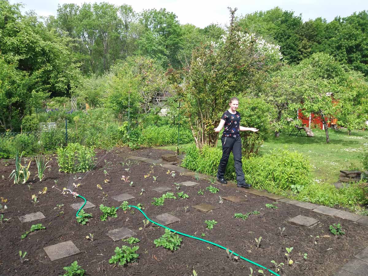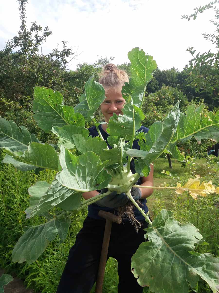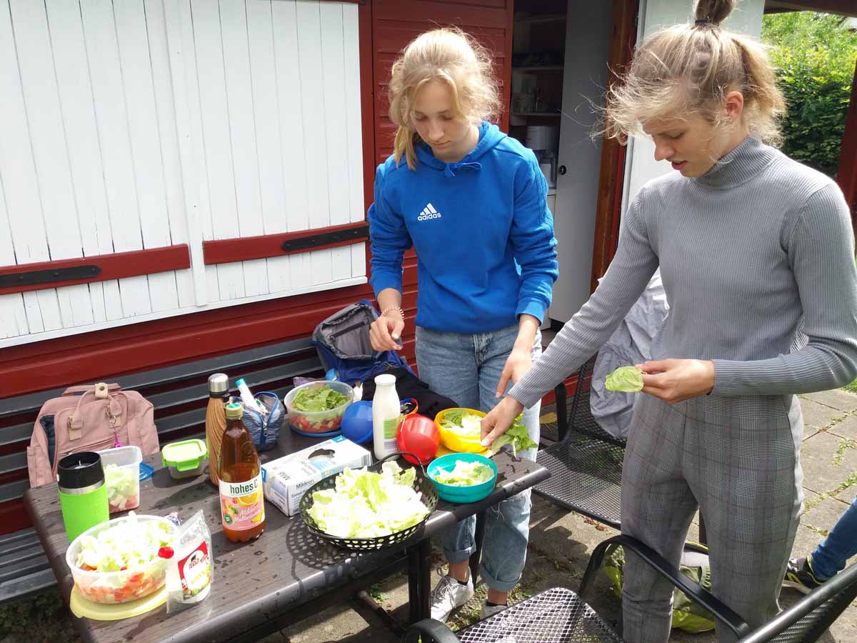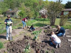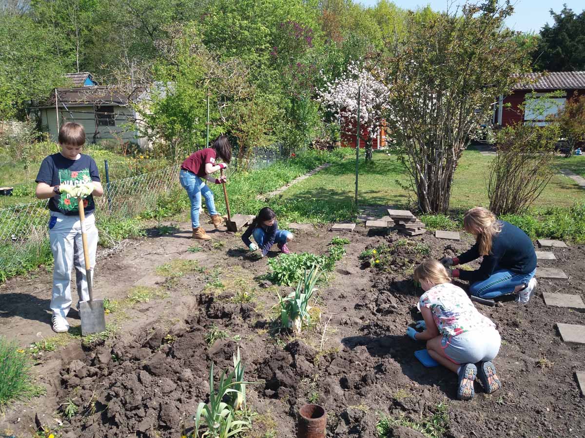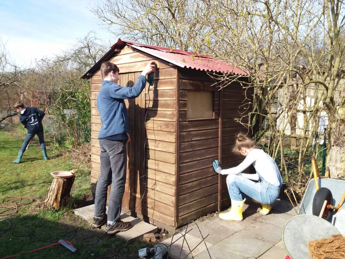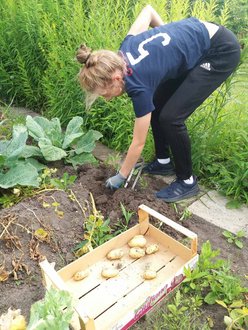 Wir fahren in Kleingruppen mit dem Fahrrad und dem Bus direkt nach Bl. 3 in den Schulgarten. Dort essen wir zusammen Mittag. Dieses bringt jede/r für sich selbst mit und kann im Gartenhaus in der Mikrowelle erhitzt werden. Danach bearbeiten wir den Garten: wir pflanzen neue Gemüsepflänzchen. Pflegen das Gemüsebeet, mähen den Rasen, schneiden Büsche und ernten das Gemüse und Obst. Manchmal reparieren wir auch Gartenmöbel, jetzt im September müsste eine Gartenbank abgeschliffen und neu gestrichen werden. Oft spielen wir am Ende noch etwas zusammen, z. B. Wikinger Schach.