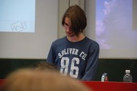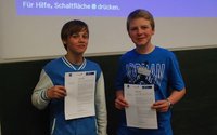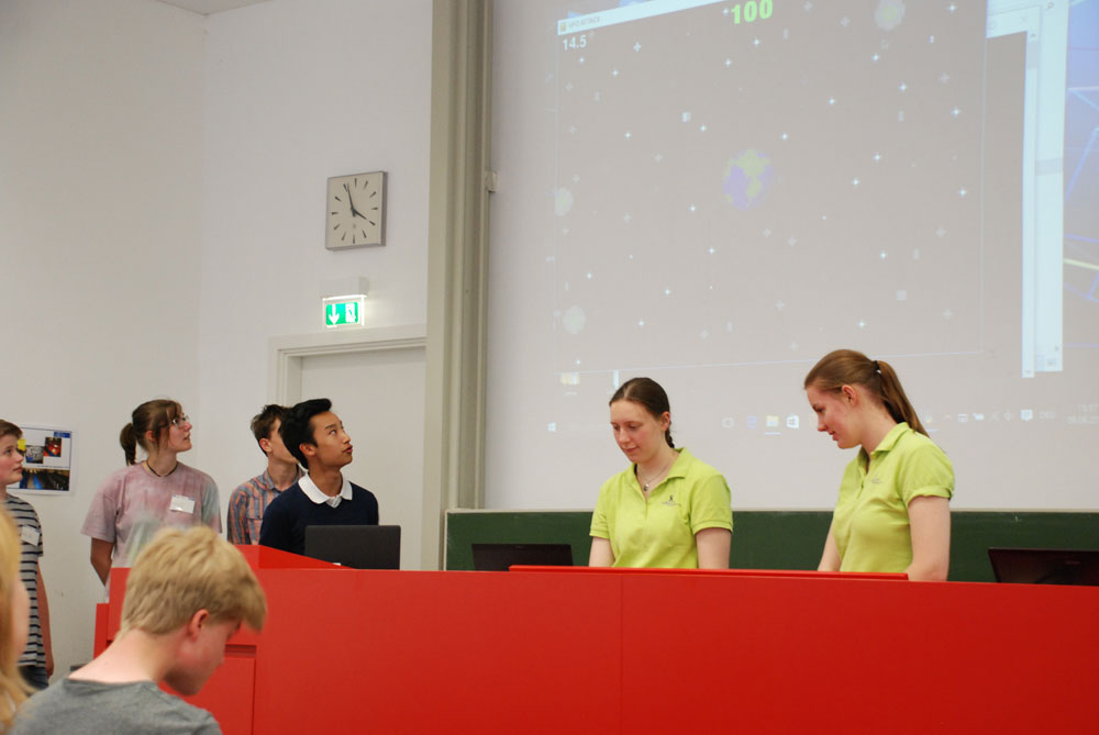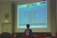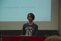 Das Highlight im zweiten Teil der Veranstaltung war aus unserer Sicht sicher das Referat, das Mateusz vor immerhin gut 100 Zuhören, zum Thema "Blender" vorgetragen hat. In lockerer und souveräner Art hat er Einblicke in seine Blenderprojekte gegeben, die nicht nur die anwesenden Schüler beeindruckt haben dürften. Die interessante Veranstaltung wurde von den beiden Musikerinnen beendet und klang bei einer kleinen Erfrischung und Gesprächen im Foyer des Hörsaals aus.