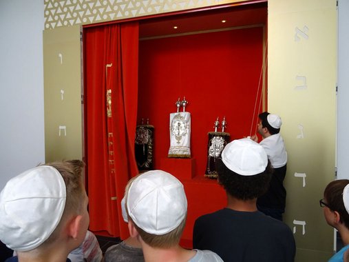 Zunächst waren viele Schüler überrascht, dass es nicht in die Kapelle des Stöckener Friedhofes ging, sondern die Synagoge ein modernes Gebäude ist. Die ehemalige „Neue Synagoge“ wurde 1938 zerstört, lediglich ein Foto im Foyer erinnert an das imposante Gebäude in der Calenberger Neustadt. Dennoch war der Aufenthalt in der Synagoge und vor allem im Gebetsraum für Schüler und begleitende Lehrer äußerst eindrucksvoll. Herr Bruckmann stellte Besonderheiten des Judentums, aber auch Gemeinsamkeiten der monotheistischen Religionen, vor und nahm sich viel Zeit für Fragen der Schüler. Als besonderes Highlight konnte zum Abschluss ein Blick auf die heiligen Thorarollen der Gemeinde geworfen werden.