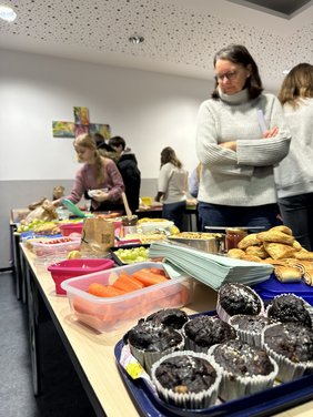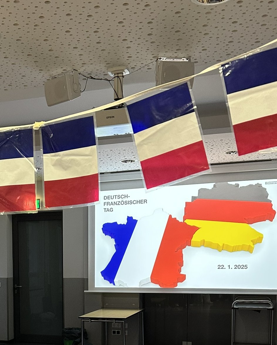 Alle Französisch-Klassen der Schule feierten am 22. Januar, dem Jahrestag des Elysee-Vertrages den Deutsch-Französischen Tag bei uns im Forum. Neben französischen Speisen gab es natürlich auch ein Büfett aus selbstmitgebrachten Speisen. Darüber hinaus wurden Spiele angeboten, wo es um das Verhältnis zu unseren westlichen Nachbarn ging oder darum, wie gut man die Franzosen eigentlich kennt. Wusstet Ihr zum Beispiel, dass in Frankreich jählich 10 Milliarden Baguettes gegessen werden?