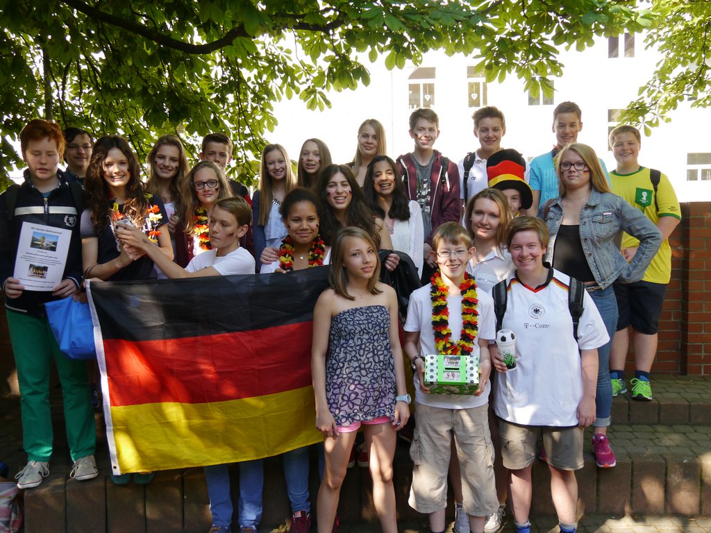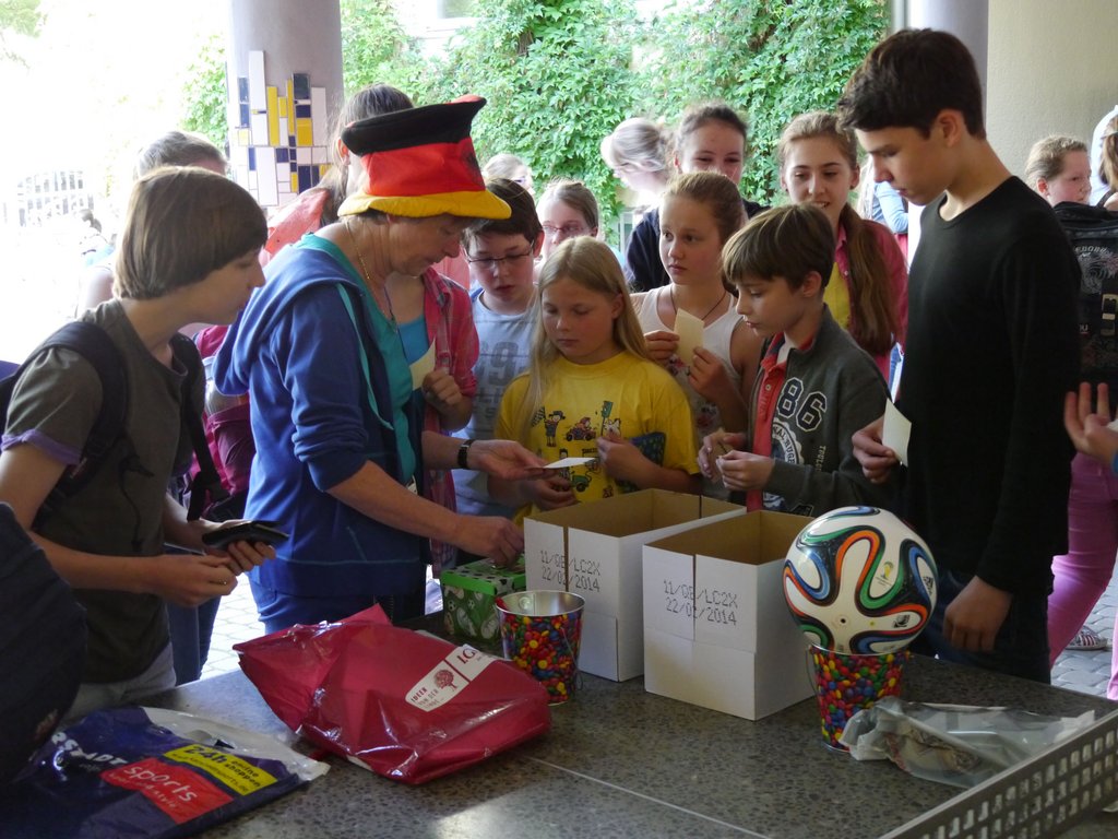 Doch damit nicht genug: Der Erfolg der deutschen Mannschaft beflügelte die Ideen. Am Freitag vor dem großen Endspiel organisierten Frau Homann-Dorau und Herr Miller in den großen Pausen gegen den Einsatz von 50 Cent ein Torwandschießen, um den Torwandweltmeister der St. Ursula-Schule zu ermitteln. Sage und schreibe drei Schüler schafften es, 4 Treffer bei 6 Schüssen zu erzielen! Und schließlich konnte man ebenfalls für 50 Cent seinen Tipp auf den künftigen Weltmeister abgeben. Als Siegerprämien winkten ein Pokal und ein WM-Ball, beides Spenden.