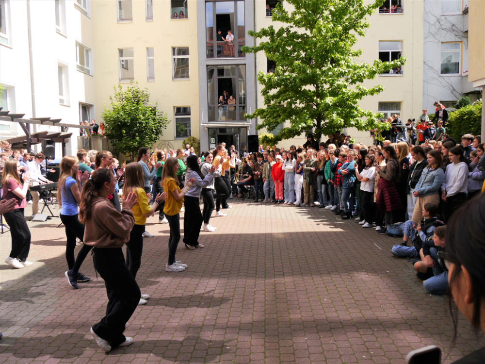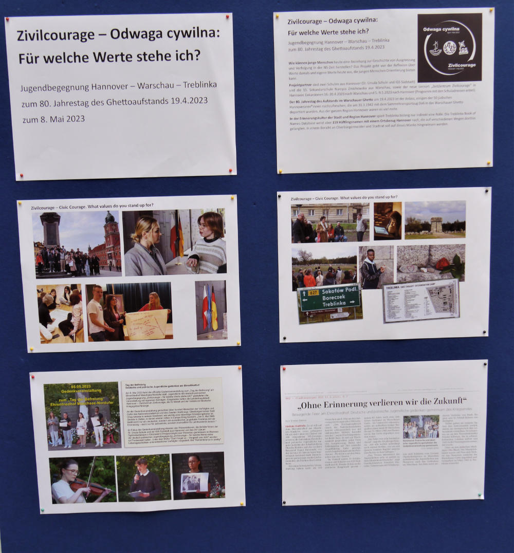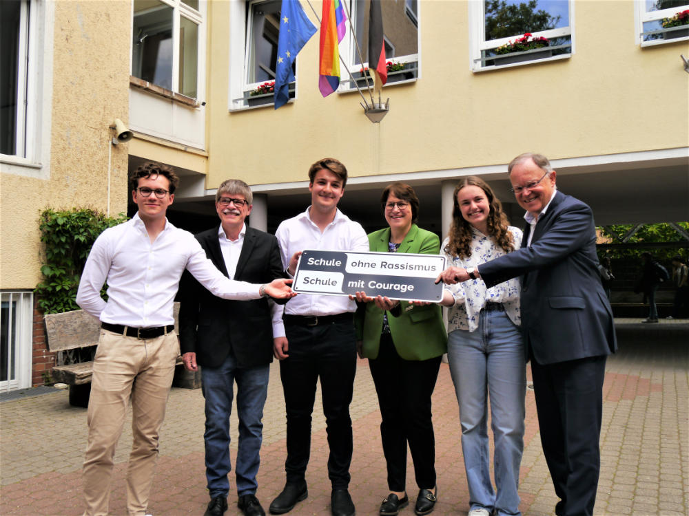 Seit Freitag, 2. Juni sind wir nun offiziell Mitglied des Netzwerks „Schule ohne Rassismus – Schule mit Courage“. Im Rahmen einer Feierstunde mit der ganzen Schulgemeinschaft auf dem Schulhof wurde uns die Plakette nebst Urkunde von Ministerpräsident Weil überreicht, der zugleich Pate für dieses Thema an unserer Schule ist. Die Schülervertretung hat bereits 2021 zusammen mit einer Umfrage damit begonnen, das Thema „Schule gegen Rassismus“ ins Bewusstsein der Schulgemeinschaft zu bringen und dann den Antrag zur Aufnahme in das Netzwerk gestellt. Die Mitgliedschaft in diesem Verbund von bundesweit über 4000 Schulen bedeutet eine Selbstverpflichtung, sich Rassismus im Alltag entgegenzustellen und dies an der Schule engagiert zu thematisieren. So wurden bei der Feierstunde Ergebnisse eines Kunstprojekts ausgestellt, die auf verschiedene Weise das Thema visualisieren. Einige Plakate hängen nun im Treppenhaus, um das Thema präsent zu halten. Das Thema Zivilcourage war in jüngster Zeit auch von Bedeutung bei der Jugendbegegnung Hannover – Warschau – Treblinka in Erinnerung an der Aufstand im Warschauer Ghetto vor 80 Jahren, an der Schüler:innen unserer Schule im April teilnahmen. Weitere Aktionen werden im neuen Schuljahr von der SV mit Unterstützung des Kollegiums geplant. Aber über allem steht die Selbstverpflichtung eines jeden von uns, eine Schule ohne Rassismus, eine Schule mit Courage zu sein!