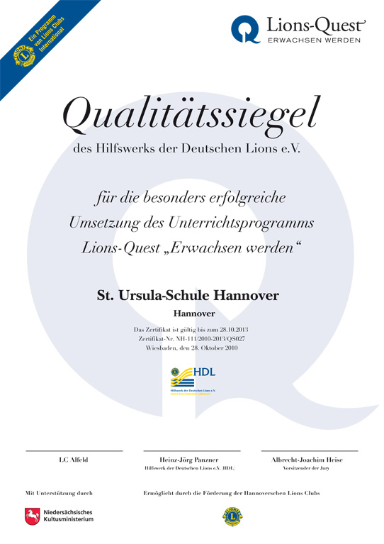 Aufgrund unseres besonderen Engagements bei der Umsetzung des Kompetenprogramms "Lions-Quest: Erwachsen werden" wurde die St. Ursula-Schule im Jahr 2010 mit dem Lions-Quest Qualitätssiegel ausgezeichnet.