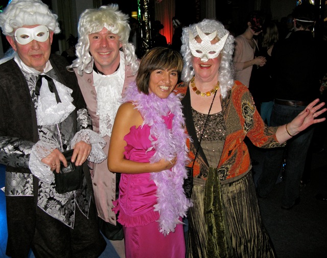 An der ebenfalls goldglänzenden Bar gab es venezianische Cocktails wie "Bellini" und "Sprizz" - vor der Videokulisse des Originalkarnevals auf der Piazza San Marco - während fantasievoll verkleidete "Antipasti", "Sushi", "Mister-Choc und Mademoiselle-Merci" (Schokolade), "Mocca-Mohr und Sugar-Babe", "Rosemarie" und "Glückskäfer" (Tombolalose) die ihrer Verkleidung entsprechenden Produkte anboten.